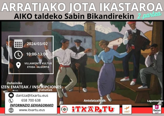 Joan den urtarrilaren 20an, zapatuz, Itxartu Dantza Taldeak eta AIKO Taldeak antolaturik, dantzazale talde eder bat elkartu zen Algortako Kultur etxean "Arratiako jota" lelopean antolatutako ikastaroan parte hartzeko. Hiru orduz dantzan eta ariketa ezberdinak egiten aritu arren, tradiziozko fandango edo jotaren inguruan lanean jarraitzeko gogoz gelditu ginen hor nonbait, eta datorren larunbatean, martxoak 2, hitzordua jarri dugu toki berean, goizeko 10:00tan berriz ere elkarrekin lanean jarraitzeko. Jota edo fandangoaren dantzakera zaharra edo tradizionala lantzeko gogorik baduzu (hainbat tokitan "Arratiako jota" deitzen dutena) hurbildu zaitez lasai Algortako Kultur Etxera.
