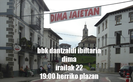 BBK Dantzaldi Ibiltariak oraingoan Arratiara garamatza, Arratiako bihotzean dagoen Dimako herrira. Berton, irailaren 22an, ostiral edo barikuz, herriko plazan eguraldi onarekin, AIKO Taldekoak erromerian dantzan ekingo diote, dantzazaleak mugitzeko asmoz. Eguraldi txarra balego, aldamenean dagoen frontoi zaharrean ekingo diote (irekita baina aterpean dago). Animatu!