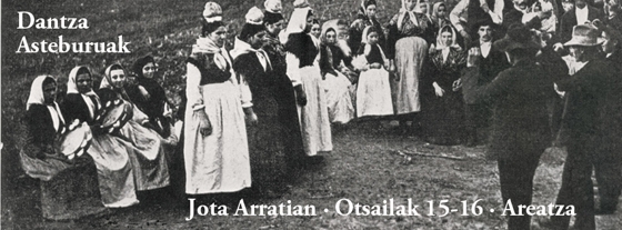 Dakizuenez, ikastaro, tailer eta erromeriez gain, ikasturte honetan berrikuntza bat dugu AIKOtarrok gure jarduera programan: Dantza Asteburuak, hiruhilero herri ezberdin batean antolatuko dugun eta protagonista nagusia dantza izango den asteburu bat. Lehenengoa azaroaren 9 eta 10ean izan genuen Zarautzen Jota (etabar) Catalunyan lema pean, eta oraingoan jotarekin ere bai, baina etxera gatoz, gurera, Arratiako bihotzean dagoen Areatzara.